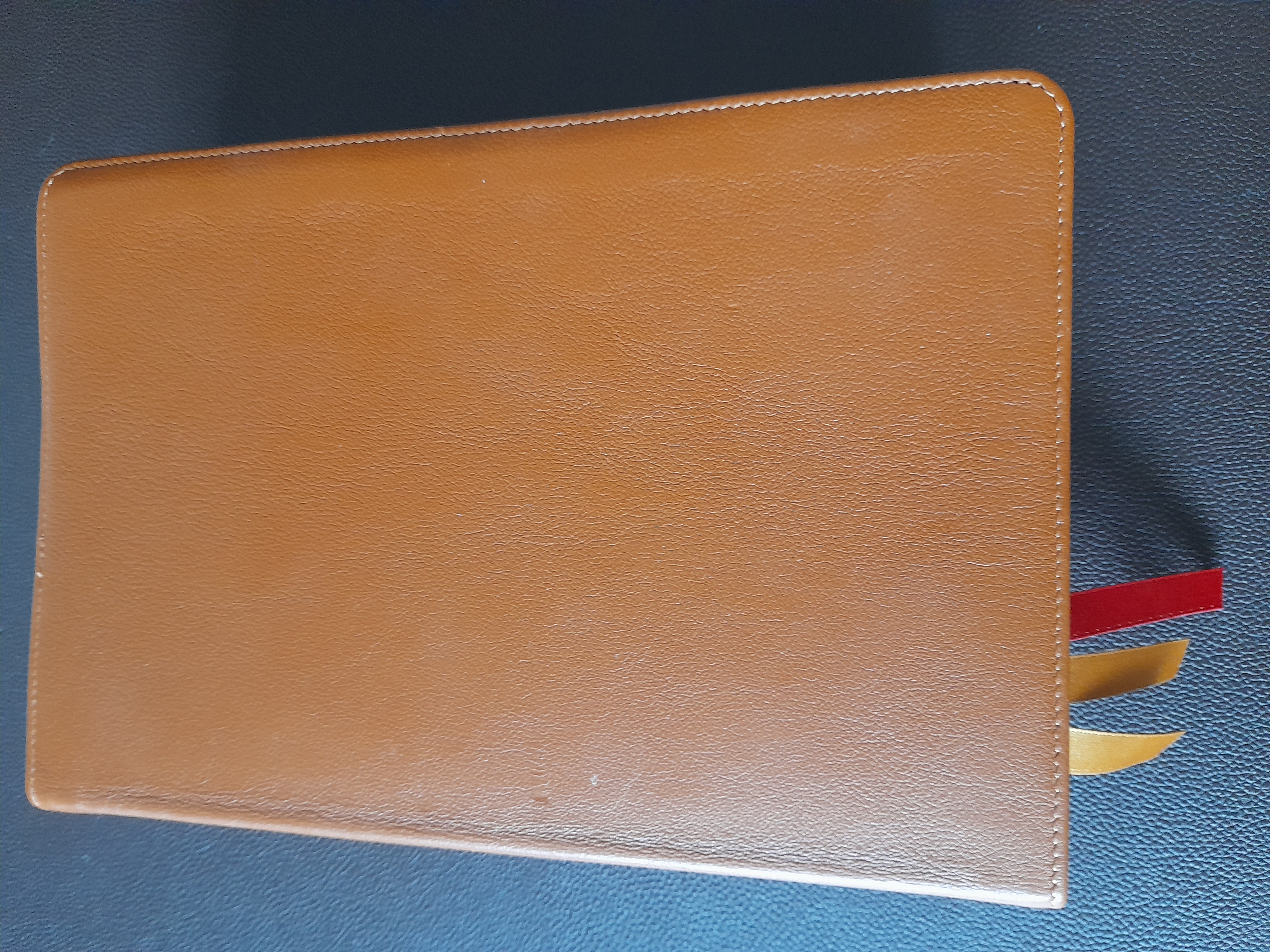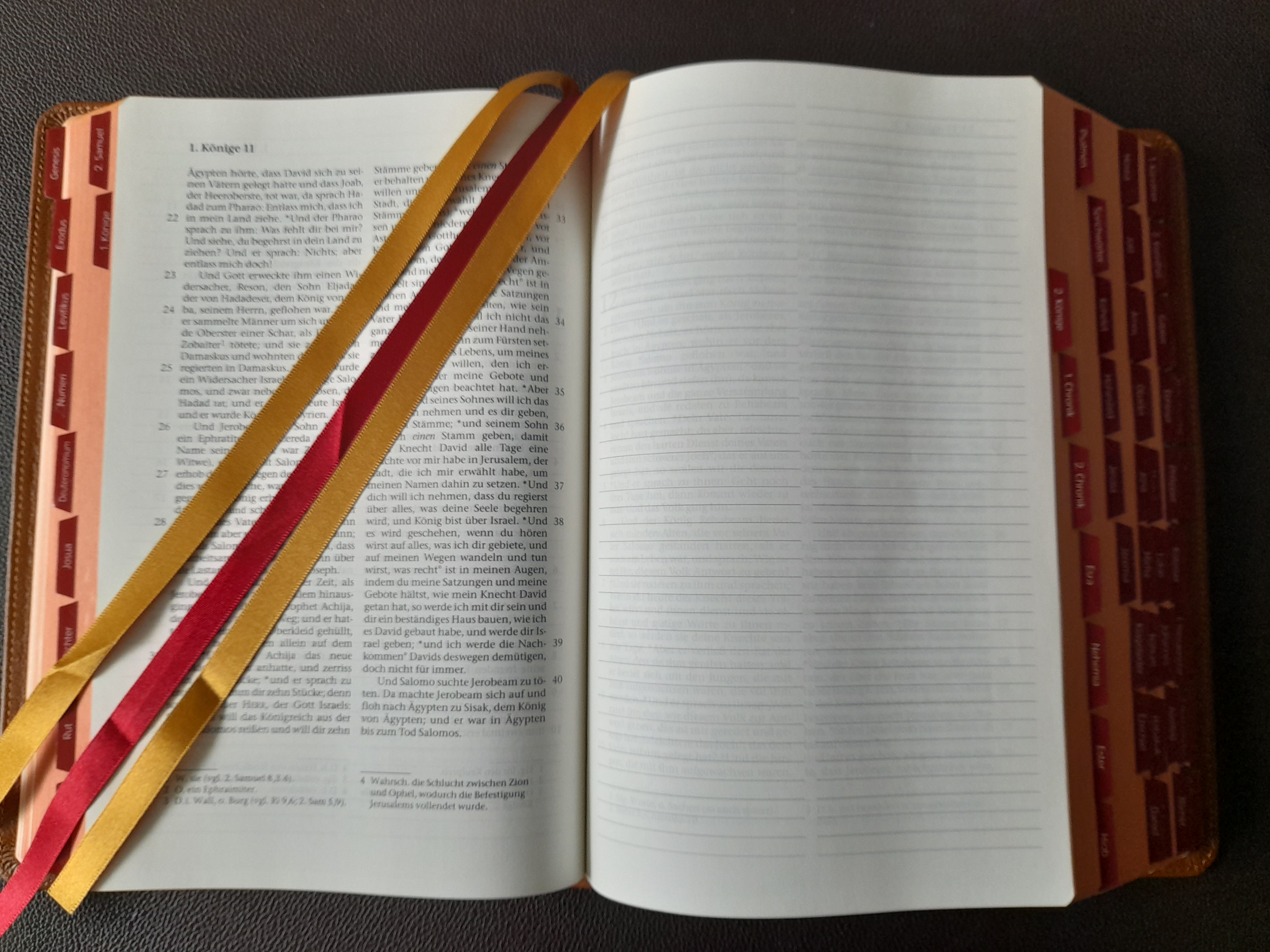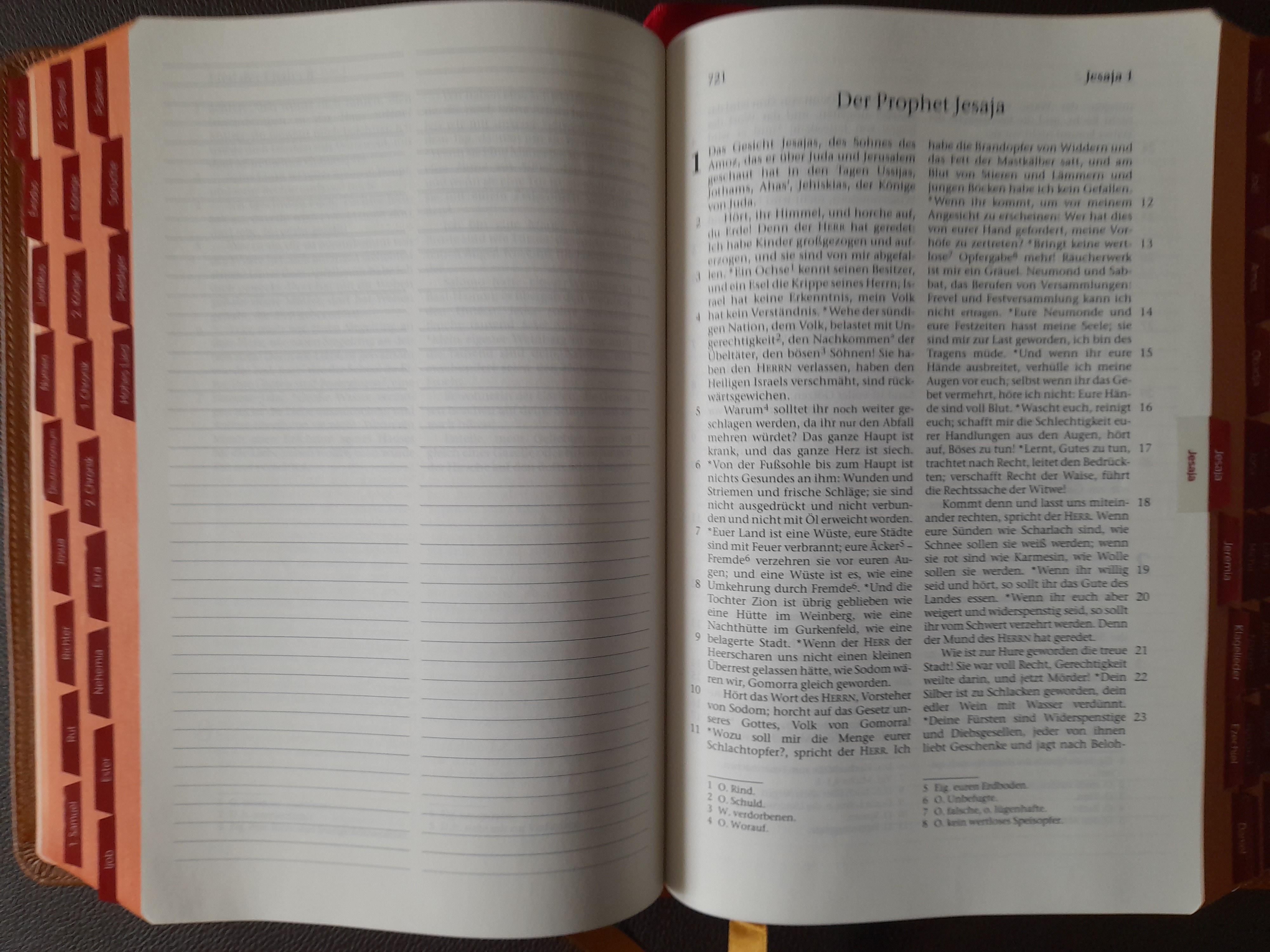 Neuwertige, limitierte Sonderausgabe der Elberfelder 2003 CSV Hückeswagen. Zwischen den Bibeltextseiten ist durchgängig je eine leere Notizseite mit feiner zweispaltiger Lineatur. Braunes Rindleder und Rotgoldschnitt und drei Lesebändchen. Am Buchrücken in Gold Aufschrift "Die Heilige Schrift", 15,5x22,7x5,3 cm